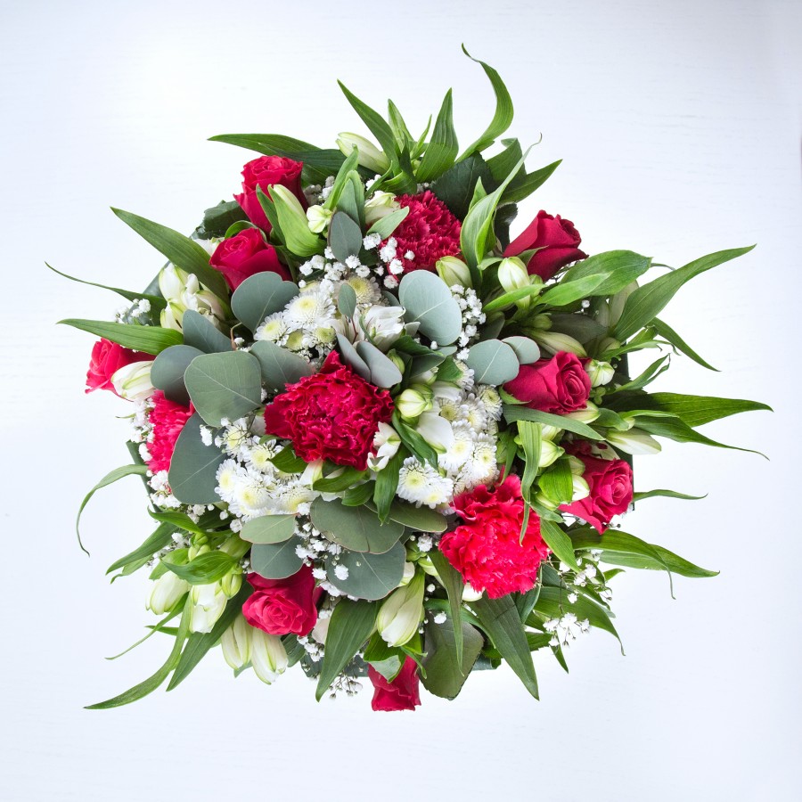 Indulge in the serene beauty of our Garden Radiance bouquet, thoughtfully designed to captivate and inspire. This enchanting arrangement boasts the bold presence of red roses, the delicate charm of carnations, and the pristine elegance of white chrysanthemums, complemented by the soft touch of gypsophila, refined white alstroemeria, and vibrant aspidistra leaves. Each flower is meticulously chosen for its superior quality and enduring freshness.